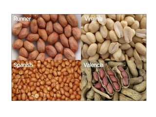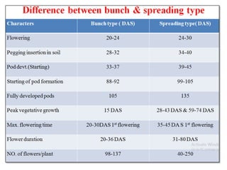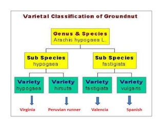The document provides an extensive overview of groundnut (peanut), a crucial leguminous plant known for its high nutritional value and as the 4th most important oilseed crop globally. It covers its scientific classification, major producing countries, cultivation practices in India, and types of peanuts, along with morphological characteristics, breeding objectives, and important varieties. Additionally, it addresses issues such as aflatoxin contamination and the genetic diversity within groundnut species.