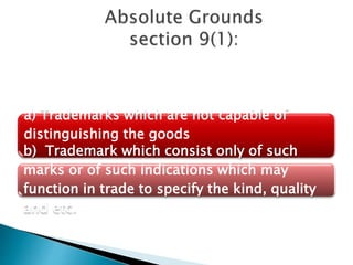 1) Trademarks that are not capable of distinguishing goods or consist only of marks that specify kind, quality, etc.