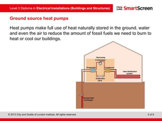 Ground source heat pumps extract heat from the ground through a system of pipes or coils to heat buildings. They work like a refrigerator by using a compressor to move heat from one place to another. The heat pump unit is installed indoors while horizontal coils are buried underground to absorb heat from the ground. Ground source heat pumps have advantages like reduced running costs and emissions but require careful installation to work effectively.