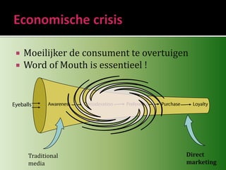 Groundswell refers to social trends where people use technologies to get what they need from each other rather than corporations. In an economic crisis, it is more difficult to convince consumers and word of mouth becomes essential. The document discusses how companies can participate in the groundswell by assessing their customers' social activities, deciding objectives, planning strategies, and using appropriate social technologies. It provides examples of how companies can take on roles like listening, talking, energizing customers, and supporting customers through social media.