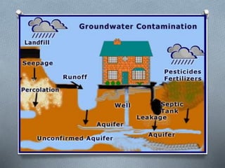Groundwater contamination can occur from various point and nonpoint sources. Point sources include storage tanks, landfills, and pipeline releases. Nonpoint sources include agricultural activities. Principal sources of groundwater pollution include municipal sources like sewer leakage and liquid wastes; industrial sources like liquid wastes, tank and pipeline leakage, and mining activities; agricultural sources like irrigation return flows, animal wastes, fertilizers and pesticides; and miscellaneous sources like urbanization, spills, stockpiles, septic tanks, and roadway de-icing. Pollutants can enter groundwater and persist for decades due to the difficulty of detecting and controlling subsurface pollution compared to surface water pollution.