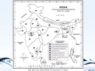 The document discusses various groundwater provinces in India, detailing how geology and climate interact to produce distinct groundwater conditions across different regions. It highlights significant factors affecting groundwater resources and describes specific provinces based on geological formations, including their characteristics and water yield potential. Key provinces mentioned include the Precambrian crystalline and sedimentary provinces, Gondwana, Deccan trap, Cenozoic sedimentary provinces, and the Ganga-Brahmaputra alluvial province.