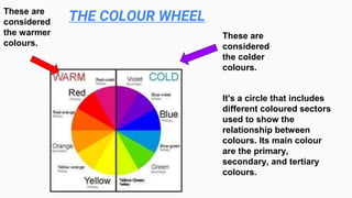 The document is about the color wheel and how it categorizes colors as either warm or cold. It provides examples of warm colors like red, orange, and yellow and cold colors such as blue, purple, and dark green. Warm colors are associated with fire and daylight while cold colors remind people of water and nighttime. The document also notes that in warm locations or seasons, interior design uses cool colors, and in cold places or winter, warm colors are utilized.
