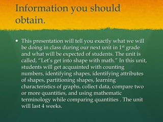 This newsletter provides information about the upcoming 1st grade math unit called "Let's get into shape with math" that will last 4 weeks. Students will learn skills like counting, identifying shapes, partitioning shapes, using graphs, collecting and comparing data using math terms. They will practice addition, subtraction and word problems using objects. Parents are encouraged to give students math practice at home. Teachers will explain concepts, work through problems, assess objectives and monitor student understanding.