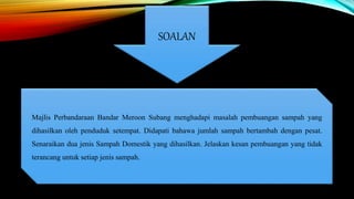 Dokumen ini membincangkan isu pembuangan sampah di Majlis Perbandaran Bandar Meru, di mana jumlah sampah bertambah dengan pesat. Terdapat dua jenis sampah domestik yang dikenalpasti: sampah organik dan sampah anorganik, yang mempunyai kesan berbeza jika dibuang secara tidak terancang. Kesan pembuangan sampah organik termasuk menjejaskan kesihatan masyarakat dan mencipta tempat pembiakan nyamuk, sementara sampah anorganik mencemarkan alam sekitar dan boleh menyebabkan bencana alam seperti banjir.