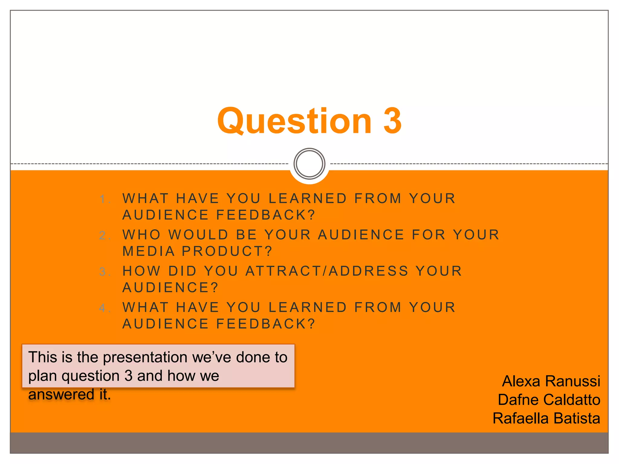The document discusses how a group presented their answers to question 3 about learning from audience feedback for their media project on homosexuality. They analyzed what worked well for their audience such as music choice and interviews, and areas for improvement like adding more statistics and diversity of interview subjects. The presentation also covered defining their target audience as ages 15-30, researching this audience, and selecting the appropriate TV channel and time slot to broadcast their documentary.