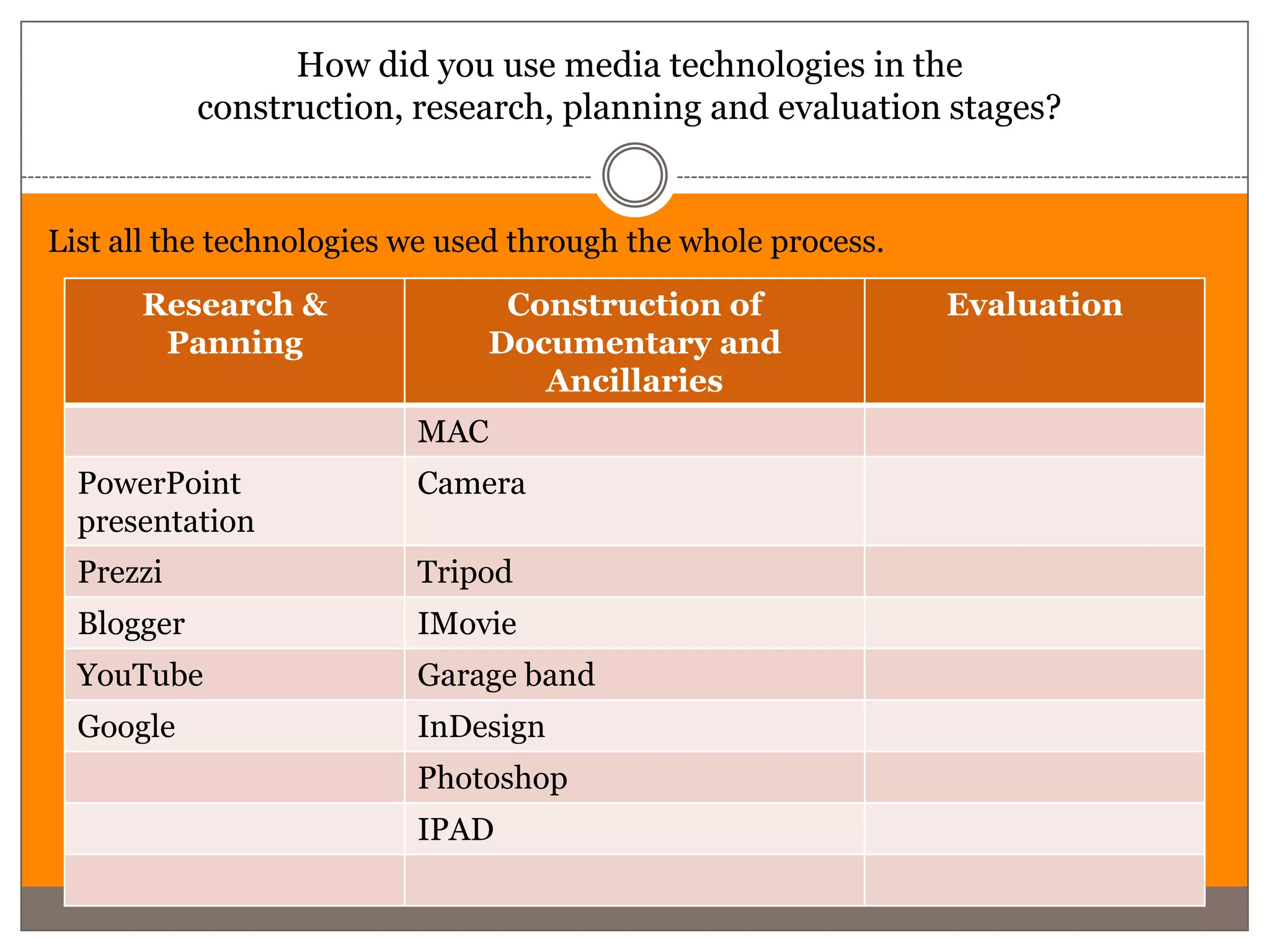 We used various media technologies throughout the construction, research, planning, and evaluation stages of our documentary. For research and planning, we used blogs to document our work, YouTube to watch inspirational documentaries, and Wikipedia for facts and statistics. In construction, we used iMovie to edit our documentary, a Canon camera to record footage, and GarageBand to record voiceovers. For ancillaries, we utilized composition and Photoshop to manipulate images, and InDesign for page layout and graphics.