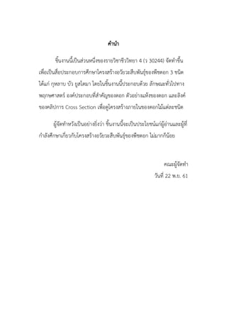 30244) จัดทาขึ้น เพื่อเป็นสื่อประกอบการศึกษาโครงสร้างอวัยวะสืบพันธุ์ของพืชดอก 3 ชนิด ได้แก่ กุหลาบ บัว ยูสโตมา โดยในชิ้นงานนี้ประกอบด้วย ลักษณะทั่วไปทาง พฤกษศาสตร์ องค์ประกอบที่สาคัญของดอก ตัวอย่างแห้งของดอก และลิงค์ ของคลิปการ Cross Section เพื่อดูโครงสร้างภายในของดอกไม้แต่ละชนิด ผู้จัดทาหวังเป็นอย่างยิ่งว่า ชิ้นงานนี้จะเป็นประโยชน์แก่ผู้อ่านและผู้ที่ กาลังศึกษาเกี่ยวกับโครงสร้างอวัยวะสืบพันธุ์ของพืชดอก ไม่มากก็น้อย คณะผู้จัดทา วันที่ 22 พ.ย. 61