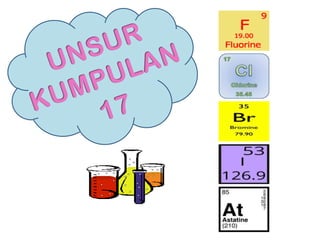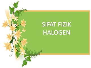 Dokumen ini menerangkan mengenai kumpulan 17 dalam jadual berkala, dikenali sebagai halogen, yang terdiri daripada elemen bukan logam yang sangat reaktif. Ia juga menjelaskan sifat-sifat fizikal halogen seperti perubahan keadaan, ketumpatan, serta warna yang semakin gelap apabila menuruni kumpulan. Penambahan jisim molekul dan daya tarikan antara molekul juga dibincangkan, bersama dengan kesan terhadap takat lebur dan takat didih.