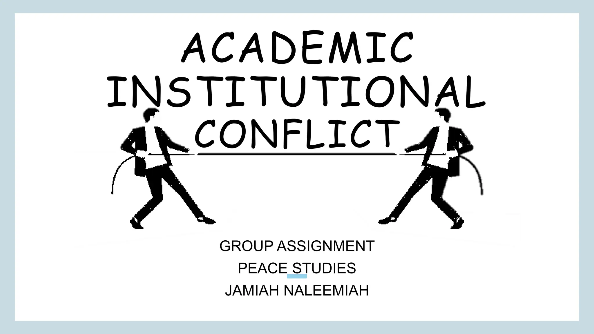 The document discusses conflicts in academic institutions, particularly among students, which arise from various factors like personality differences and poor communication. It outlines different types of conflicts, including interpersonal, intrapersonal, intra-group, and inter-group conflicts, and identifies root causes and solutions to manage these conflicts effectively. The document emphasizes the importance of open communication, mutual respect, and appropriate policies to foster a better learning environment.