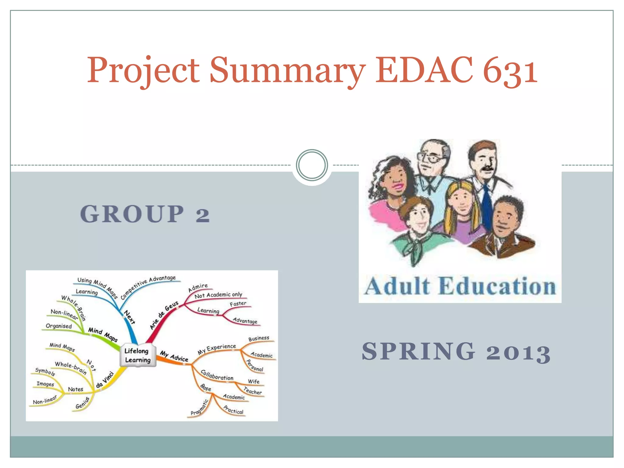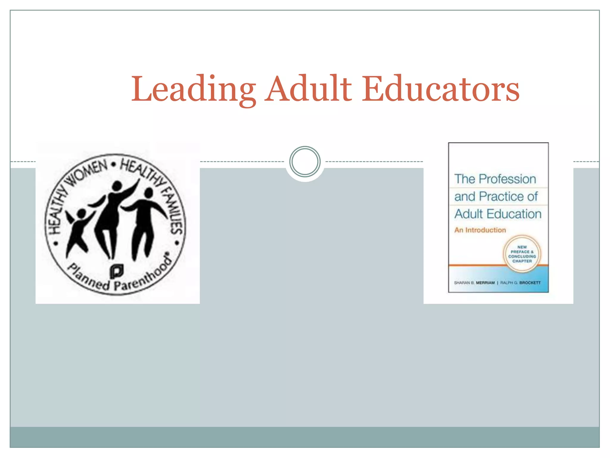 This document provides information on several topics related to adult education, including prominent adult educators Margaret Sanger and Sharan Merriam, unique adult education programs like Goodwill Industries and the Maine College Transition Initiative, important adult education organizations like Tennessee Technology Centers and the Coalition of Lifelong Learning Organizations, and reflections from four students on what they learned.