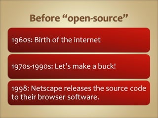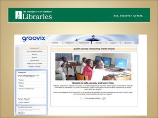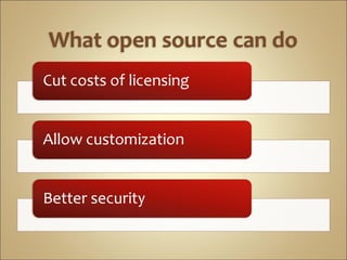 Open source software provides libraries with low-cost alternatives to proprietary software that can reduce maintenance costs and increase access to resources. Two case studies highlight libraries that implemented open source solutions like Firefox, OpenOffice, and LTSP terminals, saving over $35,000 in one case. While some compatibility issues arose, benefits included more reliable systems, reduced security risks, and meeting goals of expanding access within budgets.
