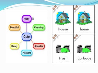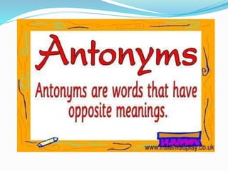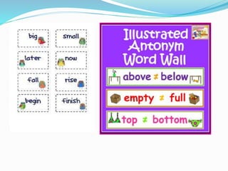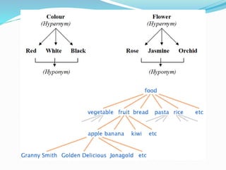 This document discusses various lexical semantic relations including homonymy, polysemy, synonymy, hyponymy, antonymy, and markedness. It provides definitions and examples for each relation. Homonymy refers to unrelated senses of the same word, while polysemy involves related senses. Synonyms have similar meanings, hyponyms have a more specific meaning, and antonyms have opposite meanings. Markedness describes when one word of a pair is marked by a prefix to indicate its status as the opposite. The document also discusses types of antonyms like reversives and directional opposites.