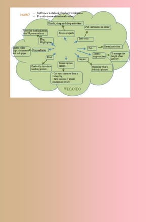 The document discusses using interactive whiteboards in primary classrooms. It outlines advantages such as improved student results, ability to be used at all lesson stages, and motivation of students. It also discusses drawbacks like lack of ready-made materials and the need for teacher training. The document provides examples of activities that can be used at different ages and English levels. It concludes with links to additional interactive whiteboard resources and examples.