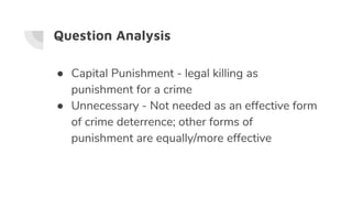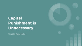 The document discusses arguments for why capital punishment is unnecessary. It presents three main arguments: 1) Capital punishment does not actually protect society and innocent people are sometimes sentenced to death, 2) There are alternative forms of deterrence that are equally or more effective than the death penalty at preventing crime, and 3) Retribution is not sufficient justification and criminals can be punished through other means such as life imprisonment without parole. Examples are given supporting each argument, such as data showing low murder rates in European countries that have abolished the death penalty.
