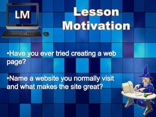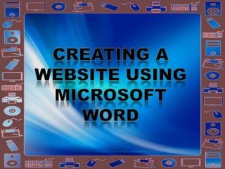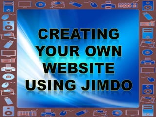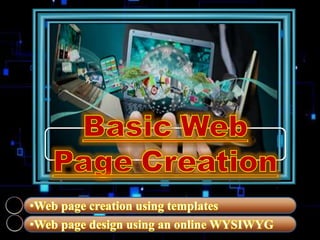 The document discusses how to create basic websites using Microsoft Word and the free web hosting service Jimdo. It provides step-by-step instructions on how to save a Word document as a web page and how to use Jimdo's WYSIWYG editor to add and edit elements like text, images, and navigation. Key terms discussed include WYSIWYG, HTML, templates, and search engine optimization. The document aims to teach basic website design skills without requiring knowledge of coding languages.