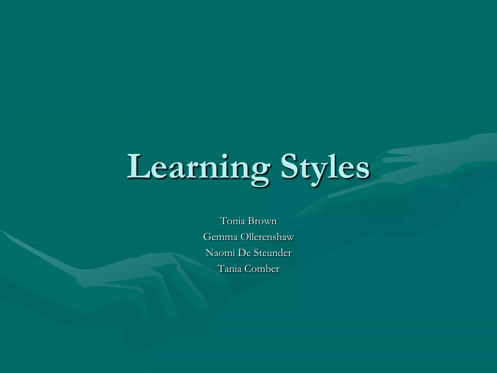 The document discusses learning styles and their importance in education. It defines learning styles as the overall patterns that provide direction to learning and teaching. Learning styles influence how students learn, how teachers teach, and how the two interact. The document presents several learning style theories and discusses visual, auditory, and kinesthetic learning styles. It emphasizes that while people tend to have a preferred learning style, engaging all three styles leads to the best learning outcomes.