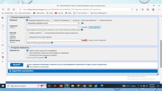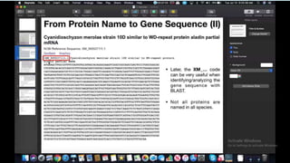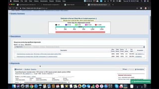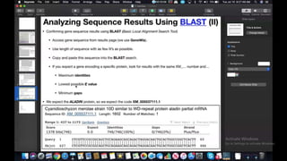 This document provides information about two BLAST searches that were conducted to identify unknown DNA and protein sequences. The results of the first BLAST search found a DNA sequence with a high percent identity and low E value, indicating it was a significant match. The second BLAST search found a protein sequence with a high percent identity and query cover, also representing a strong match. The document then explains how to interpret the key fields in a BLAST search result, such as E value, percent identity, and query cover.