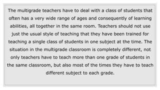 In a multigrade classroom, teachers must be flexible and use various teaching strategies to address the wide range of student ages and abilities, such as grouping students, individualized instruction, independent study, team teaching, group projects, and peer tutoring. Effective strategies for multigrade classrooms include whole class teaching, group teaching, and self-directed learning. Common methods used are lecture-recitation, small group work, independent study, paired and peer tutoring, and direct instruction. Teachers must individualize instruction to meet student needs through diagnostic assessment, grouping, and independent study with teacher support and feedback.