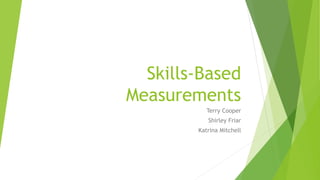 Skills-based measurements (SBMs) are used to determine if students are academically at risk or struggling. SBMs involve measuring individual skills through frequent short assessments. Scores are tracked over time to monitor progress towards instructional goals. SBMs help determine a student's instructional level and when initial goals have been met so instruction can be modified if needed. Items on SBMs assess specific goals and are ordered randomly to evaluate individual skills.