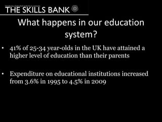 - 41% of 25-34 year-olds in the UK have attained a higher level of education than their parents, but problems exist with inequality of knowledge and effects on individuals and communities.