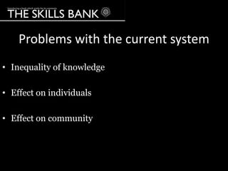 - The document proposes a "Community Skills Bank" system that allows people to register skills they can teach and want to learn, earn "skill points" to take lessons from others, and focus on basic everyday skills to avoid professional jobs.
