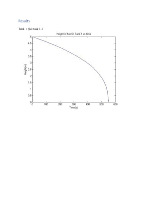 This document summarizes the analysis and modeling of fluid drainage from two containers - a cone-shaped container and cylindrical container - into a mixing tank. Differential equations and Bernoulli's equation were used to model the drainage over time from each container separately and then combined. The models were verified and plotted individually and together. It was found that Bernoulli's equation does not accurately capture the transient nature of the drainage. Modifications are recommended to account for changing velocity as the fluid level decreases.