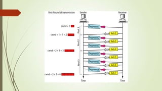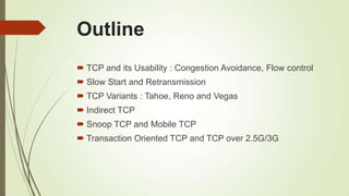 This document discusses various transport layer protocols for mobile networks. It begins by describing TCP and its mechanisms for congestion avoidance, flow control, slow start, and retransmission. It then covers several TCP variants including Tahoe, Reno, and Vegas. It also discusses indirect TCP, Snoop TCP, and Mobile TCP which aim to optimize TCP for wireless networks by handling retransmissions locally or splitting the connection. The document provides details on the algorithms and functioning of these different protocols.