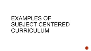 This document discusses different curriculum designs, including subject-centered design, discipline-centered design, correlated design, integrated design, spiral design, child-centered design, experience-centered design, problem-centered design, and life-situations design. It provides brief descriptions of each design, highlighting their key features and advocates. It also discusses how each design could be implemented in classroom examples.