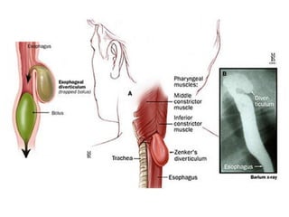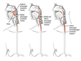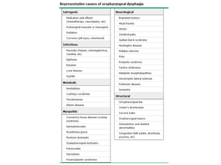This document discusses dysphagia (difficulty swallowing) including its anatomy, physiology, causes, investigation, and management. It covers the anatomy of the oropharynx and hypopharynx. The physiology section describes the three phases of swallowing - oral, pharyngeal, and esophageal. Common causes of dysphagia include presbyphagia, laryngopharyngeal reflux, xerostomia, tonsillitis, epiglottitis, oropharyngeal/hypopharyngeal malignancies, and pharyngeal pouches. Investigations include endoscopy, barium swallow, and manometry. Management is tailored based on the cause and resource availability,