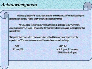 The document presents a study on the Newton-Raphson method, detailing its history, derivation, and applications in numerical analysis. It explains the method's advantages, such as faster convergence and applicability to various equations, while also acknowledging its disadvantages like higher computational demands. The presentation concludes that the Newton-Raphson method is effective for finding roots of equations with reduced time complexity.