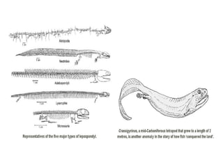 1) Amphibians first evolved from sarcopterygian fish in the Devonian period and became dominant during the Carboniferous and Permian periods before being displaced by reptiles.