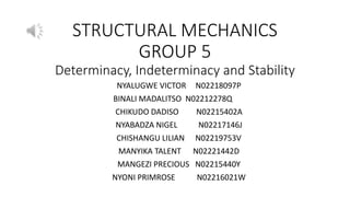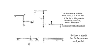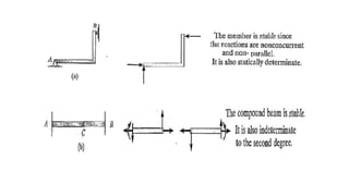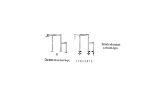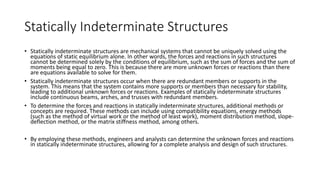 The document discusses statically indeterminate and determinate structures in structural mechanics, emphasizing that indeterminate structures have more unknown forces than equations of equilibrium can solve. It explains methods for analyzing these structures, such as energy methods and the matrix stiffness method. Additionally, it highlights how frames and pin-connected structures are classified based on their stability and determinacy.