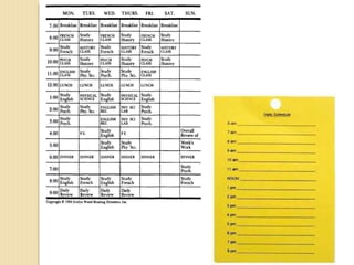 Group work requires combining talents, sharing knowledge and ideas to focus on the process. When starting, members should get to know each other and set goals while organizing tasks. If issues arise, ask a teacher for advice or renegotiate roles. Natural leaders help decide goals and monitor progress while being good listeners willing to reevaluate. Effective time management requires awareness of how time is used, prioritizing assignments, and identifying resources and study methods to avoid all-nighters.