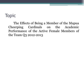 This document outlines a research project on the effects of being a member of the Mapua Cheerping Cardinals cheerleading team on the academic performance of active female members during the third quarter of 2012-2013. The research will examine the reasons for joining the team, requirements, trainings, advantages and disadvantages of membership, and how membership affects academic performance. The thesis is that being an active female member can lead to loss of concentration in academic responsibilities.