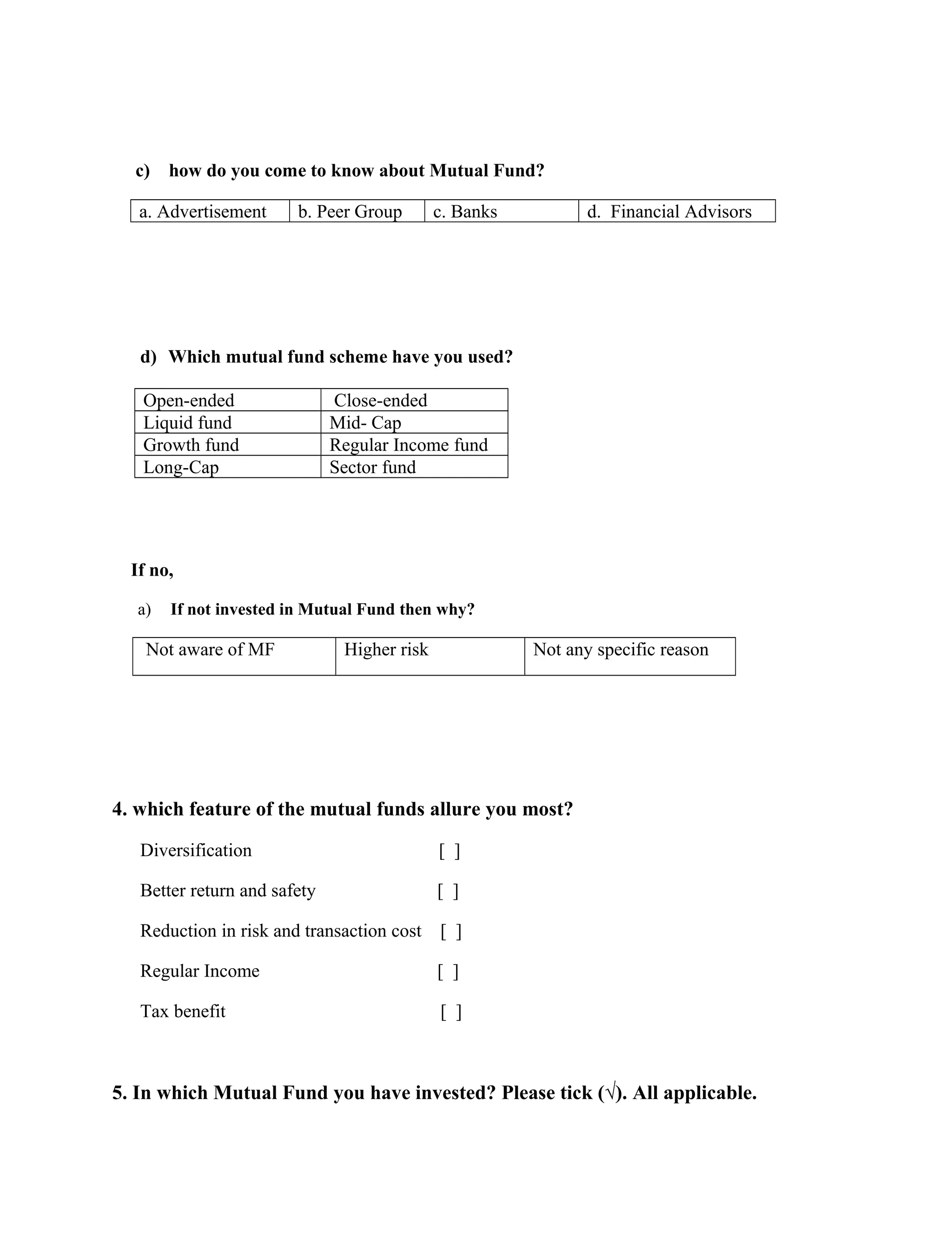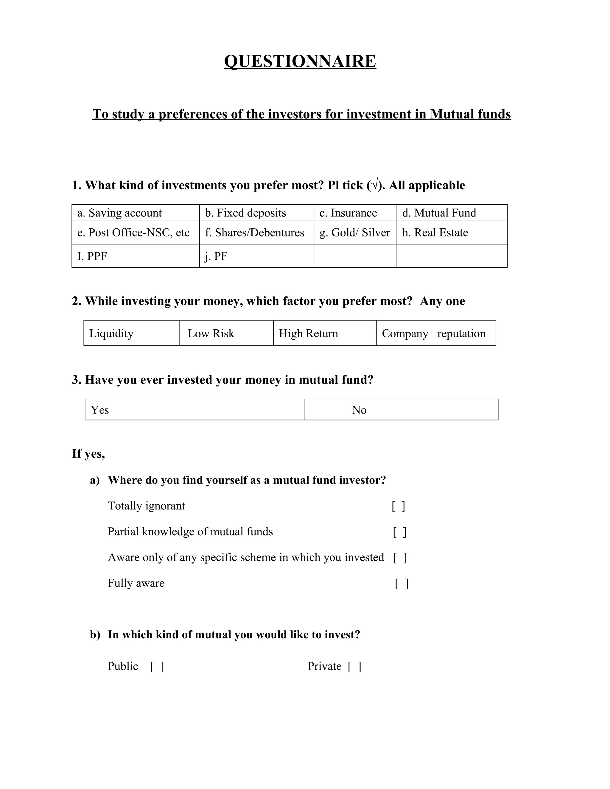 This document contains a questionnaire to study investors' preferences for investing in mutual funds. It asks respondents about their preferred investment types, factors considered while investing, experience with mutual funds, sources of information about mutual funds, preferred mutual fund schemes and fund features, preferred mutual fund companies, sectors invested in, and personal details. The questionnaire contains both multiple choice and open-ended questions to understand respondents' investment behaviors and preferences related to mutual funds.