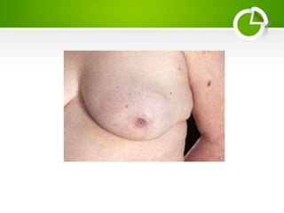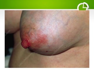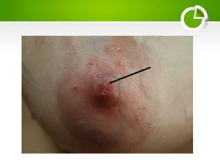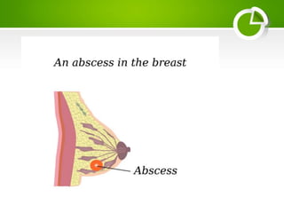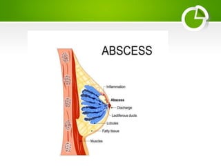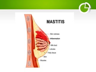 This document discusses different types of mastitis, a common inflammation of the breast tissue that can occur when breastfeeding. It outlines signs and symptoms of mastitis such as breast tenderness and pain. Common causes include issues with breastfeeding attachment, blocked milk ducts, or stopping breastfeeding suddenly. Treatment involves continuing to breastfeed or express milk, applying heat or cold compresses, and potentially antibiotics. Prevention focuses on proper breastfeeding techniques and emptying the breasts regularly to avoid blockages. The document also briefly discusses other breast conditions such as cysts, fibroadenomas, and breast abscesses.