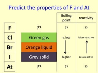 The document compares the properties of the halogens (F, Cl, Br, I, At). It shows that fluorine has the lowest boiling point and is the most reactive, while iodine has the highest boiling point and is the least reactive. Fluorine forms a yellow gas, chlorine forms a green gas, bromine forms an orange liquid, and iodine forms a grey solid. Astatine is predicted to have a higher boiling point than iodine and be less reactive. Displacement reactions are discussed, where more reactive halogens can displace less reactive ones from their compounds.