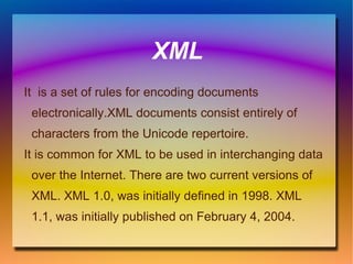 The document discusses four topics: XML, MP3, WiFi, and B2B. XML defines rules for encoding documents electronically and consists of characters from Unicode. It is commonly used to exchange data over the Internet. MP3 allows music to be easily carried and played without loss of voice quality. WiFi is the brand name for wireless LAN connectivity that is used in devices like phones, music players, and cameras. B2B describes commerce transactions between businesses along the supply chain from manufacturer to wholesaler to retailer.