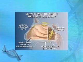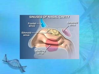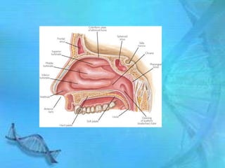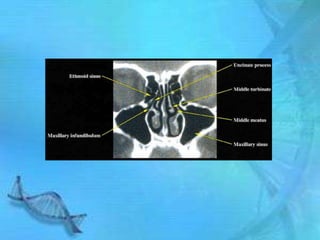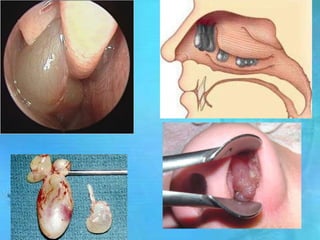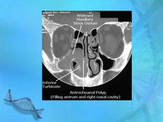 This document provides information about nasal polyps through three parts. Part 1 discusses the anatomy of the nasal cavity and its relationship to polyps. It describes the structures of the nasal septum and lateral walls. Part 2 defines nasal polyps and classifies them according to location. It also discusses their etiology, pathogenesis, symptoms, signs, diagnosis and treatment options. Part 3 presents two case studies of patients presenting with nasal polyps - one involving an antrochoanal polyp and the other involving bilateral ethmoid polyps. Both cases discuss the relevant history, examination findings, investigations, diagnoses and treatment plans.