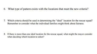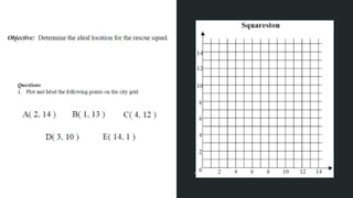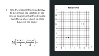 The document outlines two group activities involving the placement of a rescue squad in Squarestown, focusing on the concepts of midpoint, slope, and distance. Participants must determine equidistant locations from two houses and explore the implications of these locations, considering both fairness and distance efficiency. Additionally, the document prompts students to evaluate the advantages and disadvantages of their chosen rescue squad locations, providing a basis for decision-making from a mayoral perspective.