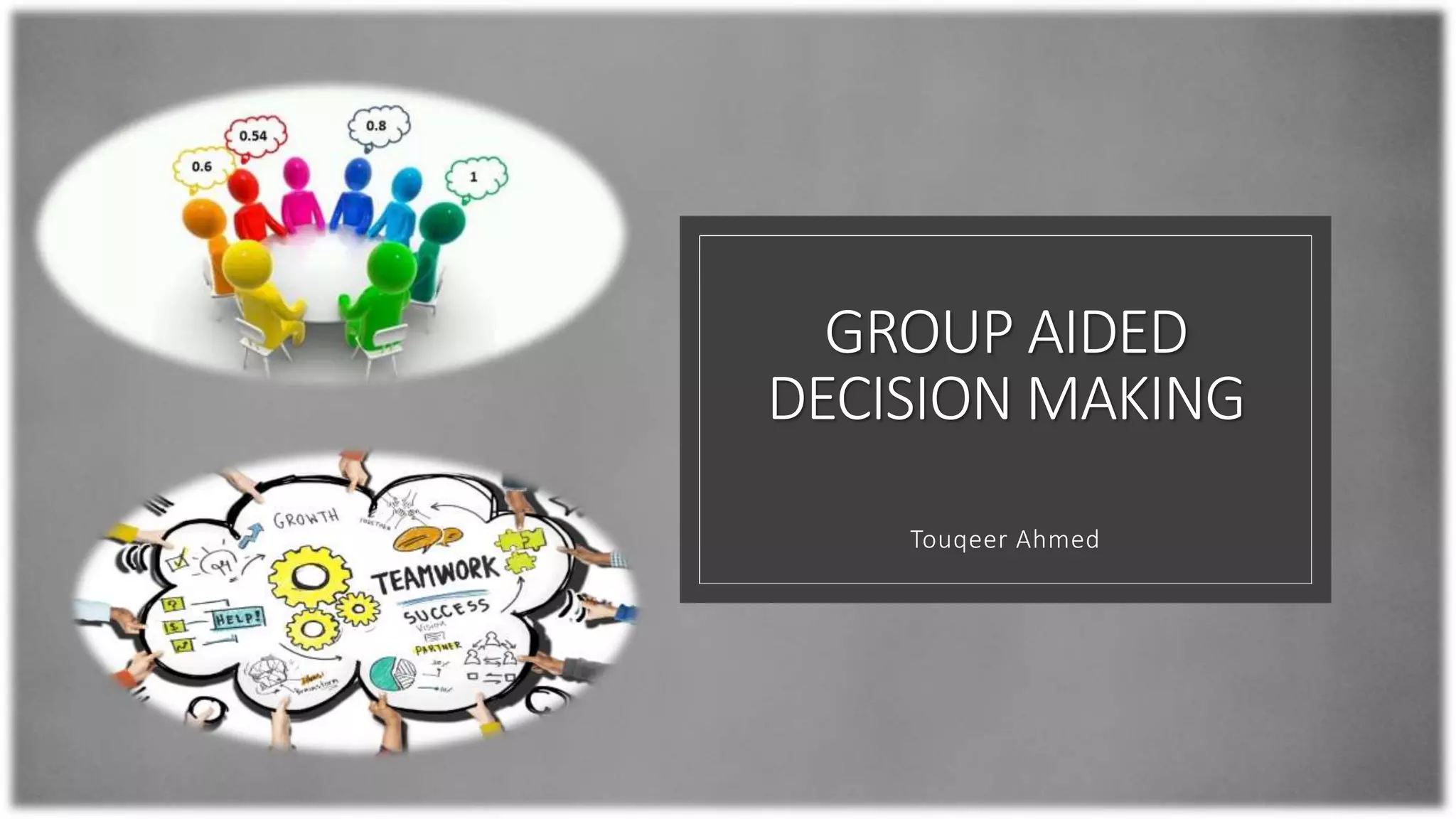 Group aided decision making is a collaborative process where multiple individuals analyze problems and evaluate alternatives to reach a solution. Techniques like brainstorming, dialectical inquiry, nominal group technique, and delphi technique facilitate diverse input and consensus among group members. While group decision making can reduce bias and enhance understanding, it may also lead to groupthink and dominance by more powerful individuals.