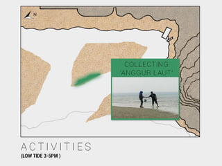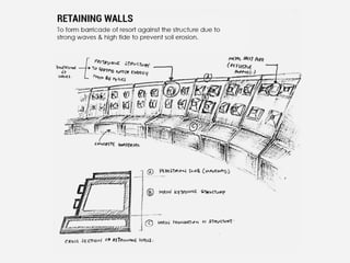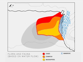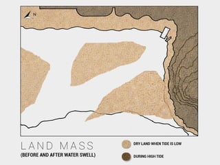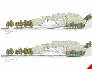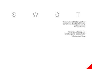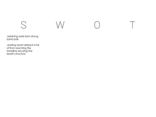 This document provides a site analysis for a coastal area. It includes sections on existing structures, landscape features, climate studies, views and vistas, circulation patterns, and proposed activities. Plans and diagrams show the location, contours, vegetation, and tide patterns. Climate data includes sunlight, shadows, winds, rainfall, humidity and temperature variations. Soil conditions and erosion risks are also evaluated. The landscape offers views of the sea but access is limited in some areas. Proposed improvements could enhance safety and the visitor experience.