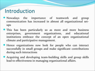 The document provides information on various forms of group communication used in organizations. It discusses group discussions, brainstorming, the nominal group technique, and the Delphi technique. Group discussions are commonly used for decision making, problem solving, and selecting job candidates. During group discussions for selection purposes, candidates are evaluated on their knowledge, communication skills, group behavior, and leadership potential. Effective listening, clear expression, and appropriate language are important communication skills evaluated during such discussions.