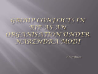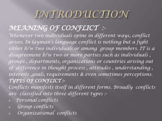 The document discusses the topic of conflict, defining it as a disagreement between individuals or groups arising from differences in thoughts, attitudes, interests, and perceptions. It describes three main types of conflict - personal, group, and organizational. Group conflict is defined as a disagreement between members of the same group or between different groups. Causes of group conflicts include individual egos, incompatible goals, differences in values and perceptions, and communication distortions. The document then discusses intragroup and intergroup conflicts in more detail.