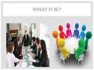 This document discusses various techniques for group decision making. It outlines Brainstorming, Nominal Group Technique, Delphi Technique, Devil's Advocacy, Electronic Meetings, Fish Bowling, Didactic Interaction, and Interacting Groups. For each technique, it provides a brief description of what it is and how it works to facilitate group decision making. The document was presented by Arif Khan, Poonam Somra, and Hemant Jain to Dr. Manjoo Saraswat on the topic of group decision making techniques.