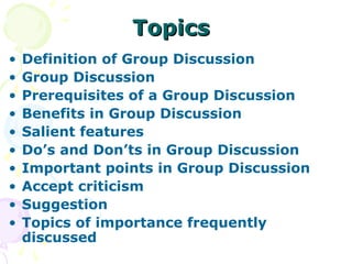 The document discusses the key aspects of group discussions, including the definition, prerequisites, benefits, features, dos and don'ts. It notes that a group discussion involves 8-12 members discussing a topic for 20-30 minutes, allowing evaluators to assess participants' communication skills, knowledge, leadership abilities, and how they accept criticism. Some important points are to be assertive but also a good listener, use appropriate language, make analytical points backed by facts, and maximize participation throughout the discussion. Common topics discussed include issues related to India, technology, society, and culture.