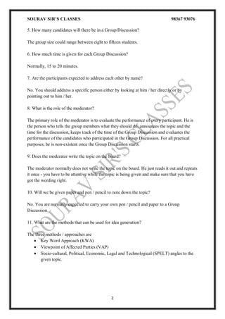 The document provides a comprehensive guide on group discussions (GD), detailing their purpose in evaluating candidates' communication skills and attributes crucial for selection processes. It explains the format of GDs, the role of the moderator, methods for generating ideas, and the types of topics typically discussed, including knowledge-based and abstract subjects. Key strategies for participants include effective communication, listening, and content mastery, alongside an emphasis on group behavioral and leadership skills.