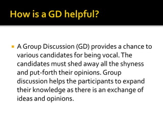 A group discussion (GD) involves participants discussing a topic for a set time, assessing skills such as communication and teamwork. GDs encourage candidates to express their opinions and enhance their knowledge through the exchange of ideas. Guidelines include active participation, proper body language, and maintaining respect, while avoid distractions or aggressive behavior.