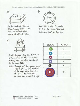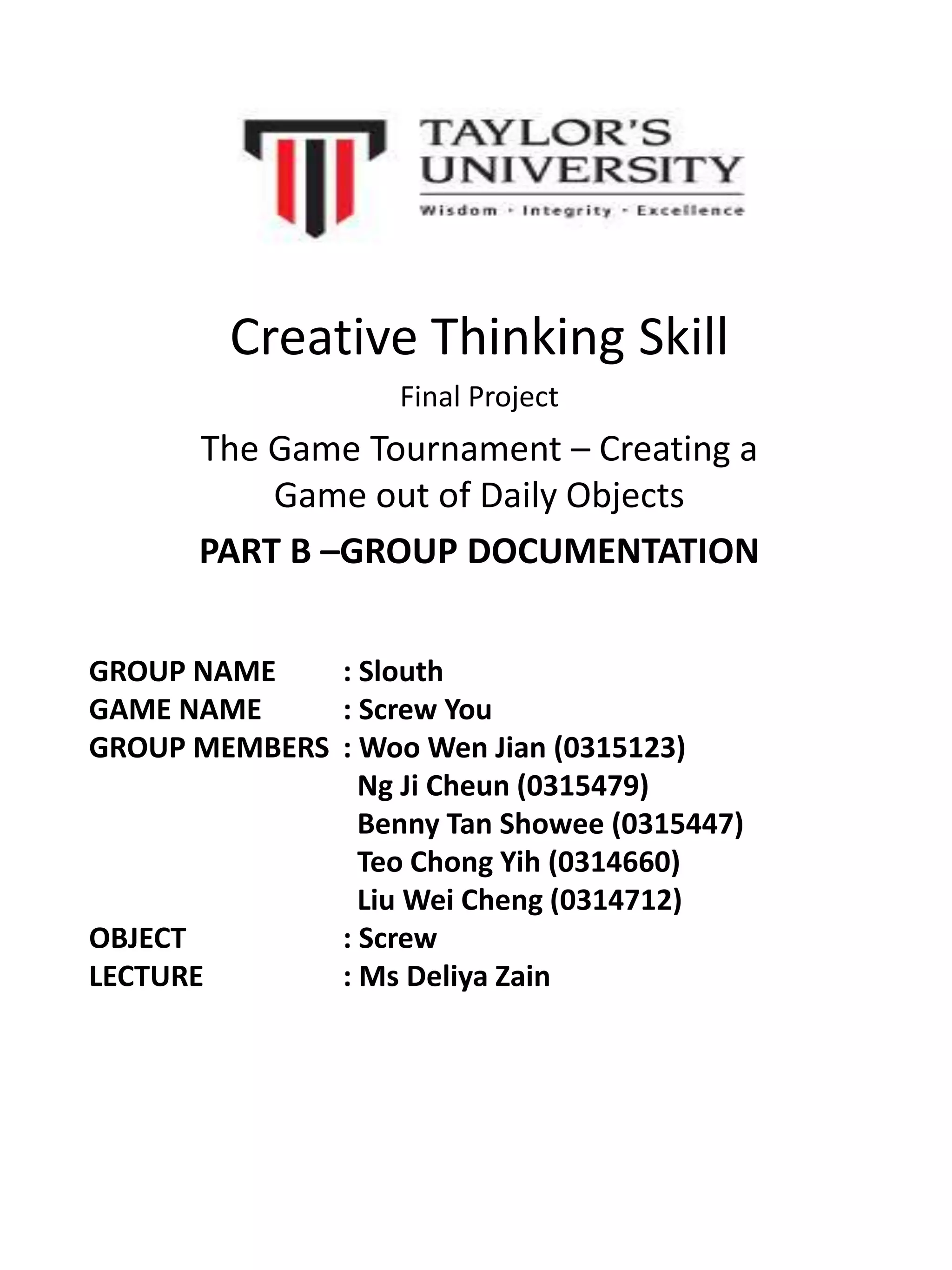 The document summarizes a game tournament held by a group of students called the Sloaths. Their game was called "Screw You" and used screws and screwdrivers as the objects. The tournament had 15 games created by different student groups that played each other's games in rotations over three sessions totaling around 4 hours. Groups earned points for their performance in other groups' games. Awards were given throughout for best costume, most energetic, and best game. In the end, the group with the most overall points from all games was announced as the winner.